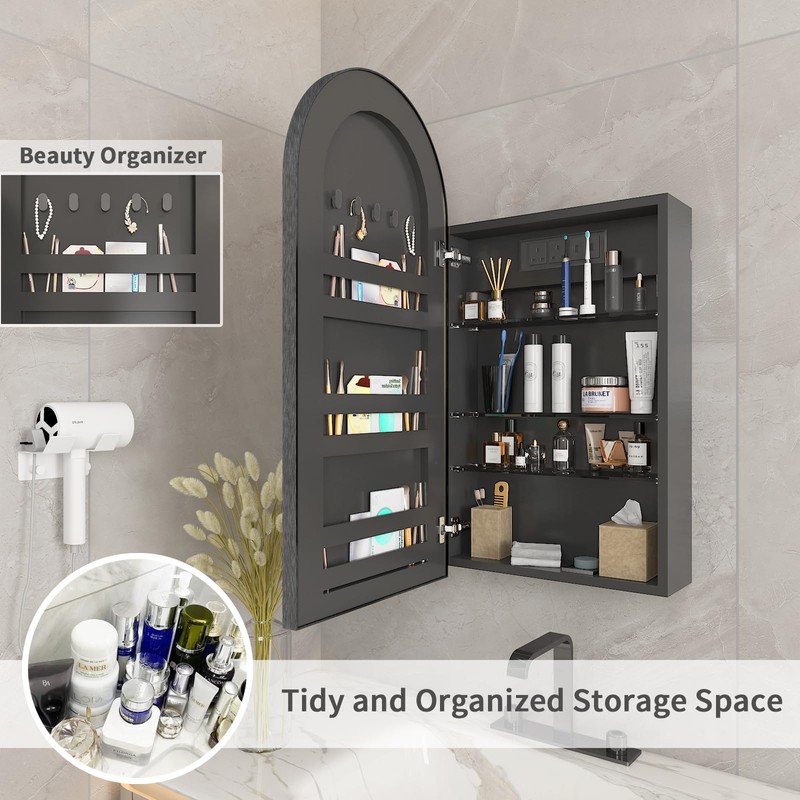 FKWin Arched Medicine Cabinets with Mirror, Bathroom Storage with Charging Station and 3 Adjustable Shelves, Bathroom Mirror with Storage, Bathroom Cabinet, Medicine Cabinet Mirror, 20"x34", Black