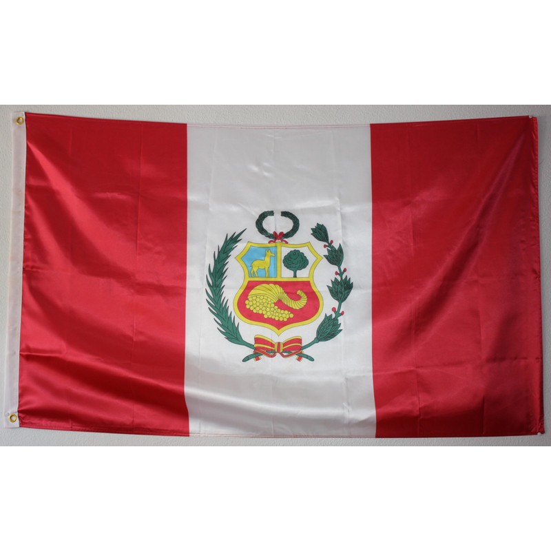 FLAG OF PERU WITH SHIELD. PREMIUM SATIN QUALITY. LARGE SIZE 150X90 CM.