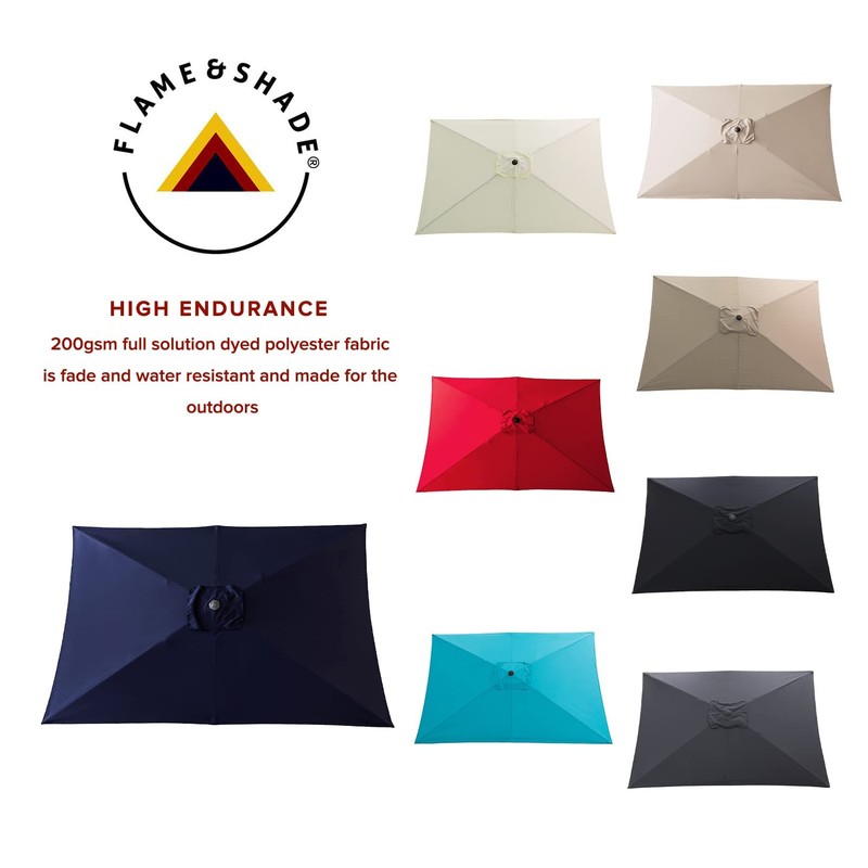 FLAME&SHADE has crafted an enviable reputation for quality and customer service. This 6.5 feet rectangular market umbrella is manufactured using strong and durable powder coated metal components designed to withstand the harshest elements. The premium 200gsm solution dyed polyester fabric is specially treated to minimize the fading effects of prolonged UV exposure. The canopy is easy to open and close using the simple operated crank system. Featuring a handy push button tilting function that helps adjust the angle of the canopy with ease, you are sure to enjoy relaxing times under this FLAME&SHADE umbrella.