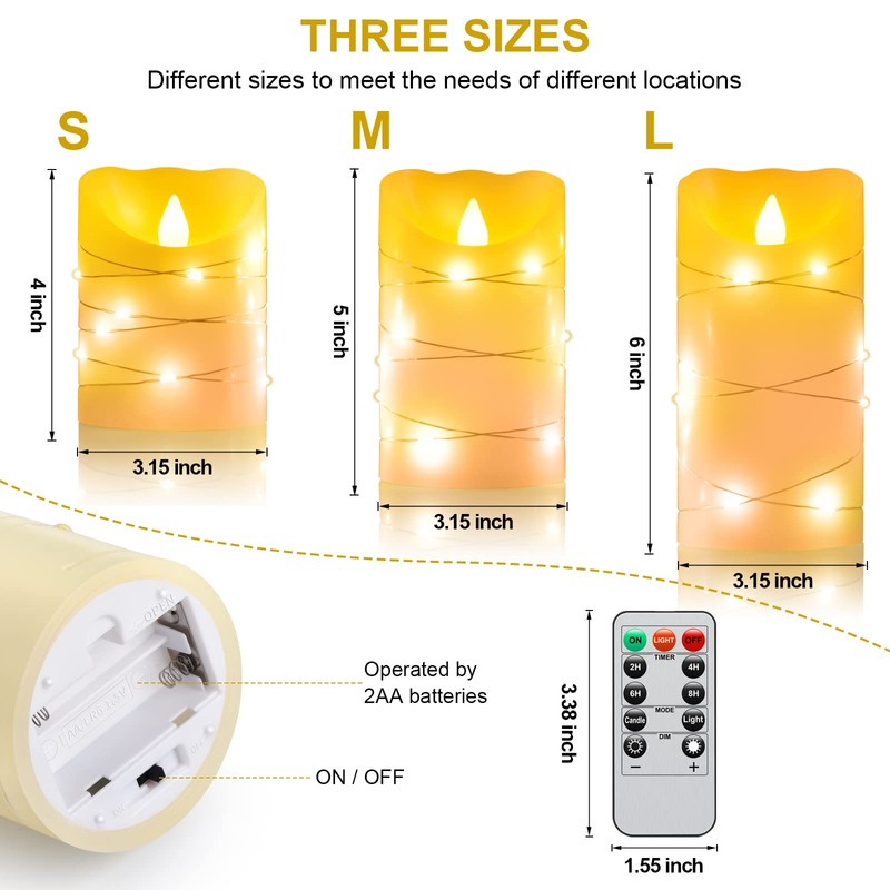 - Package includes: Each set of candles comes with 3 cylindrical flameless candlesH4"5"6"Dx2, an 11 button remote control, and a user manual. Each candle has a switch at the bottom (excluding the battery).