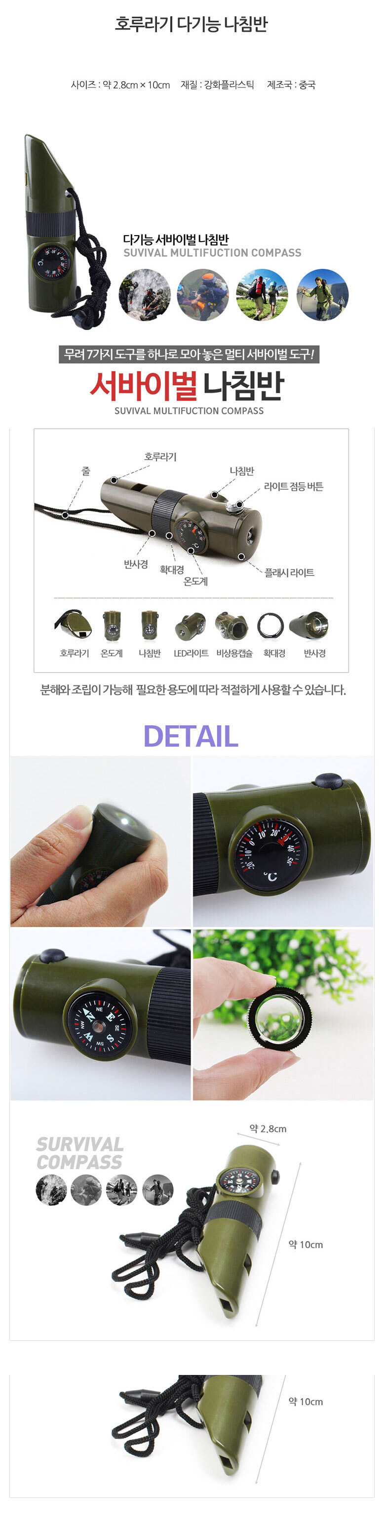 - Key Features: Whistle, string, compass, light button, reflector, magnifying glass, flashlight, thermometer