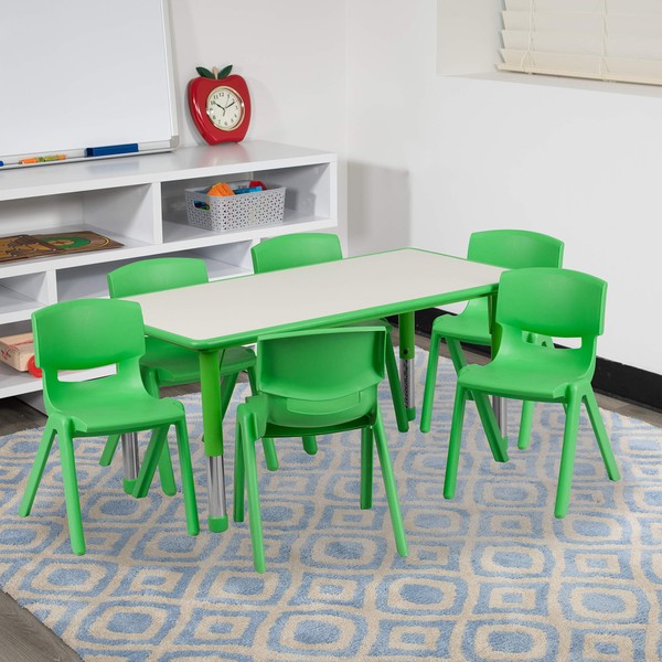 Flash Furniture Emmy Adjustable Classroom Activity Table with 6 Stackable Chairs, Rectangular Plastic Activity Table for Kids, 23.625" W x 47.25" L, Green/Gray