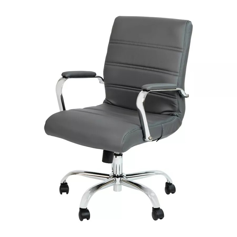 Flash Mid-Back Gray LeatherSoft Executive Swivel Office Chair/CH Frame & Arms Toss out that old and boring office chair that you've had for years because it's time for an upgrade with this sleek mid-back LeatherSoft office chair. No longer used in just offices, you are seeing office chairs used in nail salons, car shops, and stores to help busy workers achieve maximum comfort while performing their work duties. Upholstered in soft and durable LeatherSoft upholstery and paired with chrome finishing help construct this modern office chair. Designed with your comfort in mind, this ergonomic desk chair features ample padding to get you through an 8-hour workday or be your seating of choice to furnish your conference room. With its adjustable features, you can lean back while you take a quick phone call or lock in an upright position when it's time to focus. The knob located underneath the seat adjusts the force needed to recline. Improve the look at your desk or work area with this stylish Mid-Back Gray LeatherSoft Office Chair with Chrome Base that is highlighted by attractive horizontal line stitching. A waterfall front edge seat reduces pressure off your legs while the armrest pads relieve the pressure off your necks and help round out the look and comfort of this chair. [GO-2286M-GR-GG]- Finish: Chrome Metal