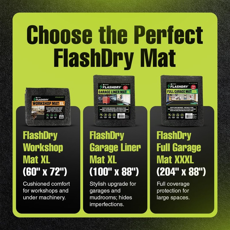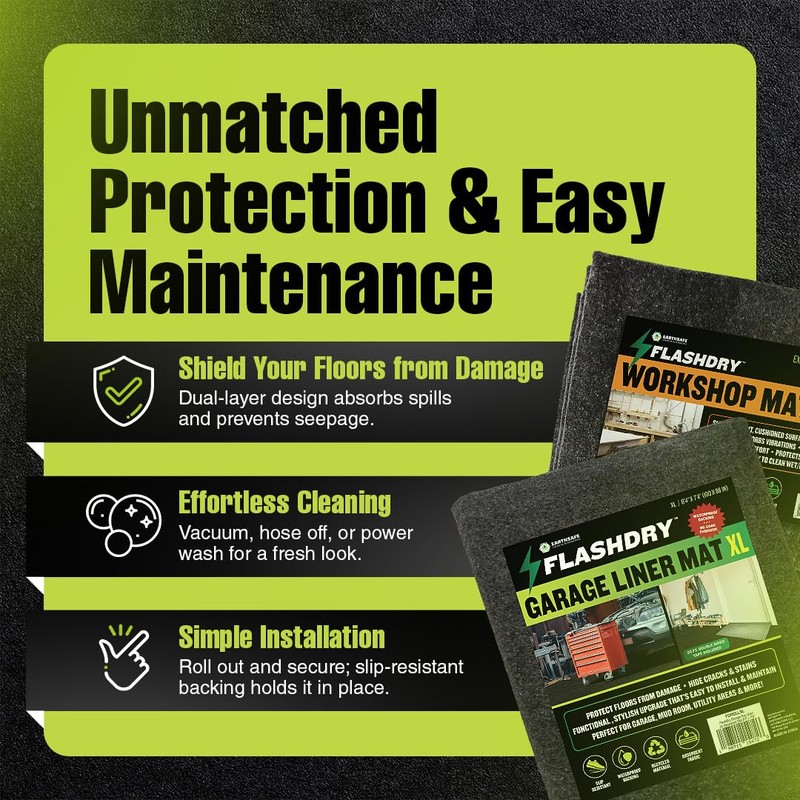 - Protects & Transforms Your Garage Floor: Shield your garage floor from oil leaks, spills, tire marks, and hide unsightly cracks or stains. The FlashDry XL garage floor mat enhances your space into a showroom-quality garage or workshop.