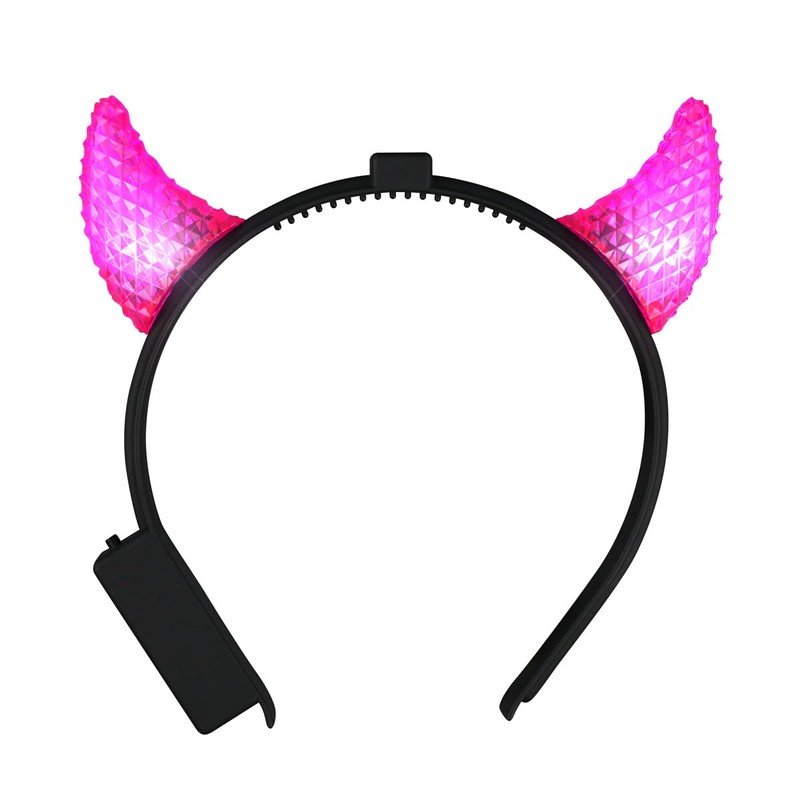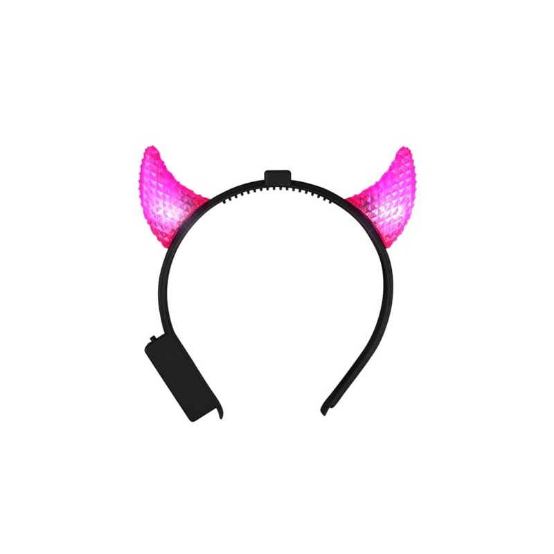 - FUN FEATURES: Comfy Black Headband with Facetted Horns and Pink LED Lights
