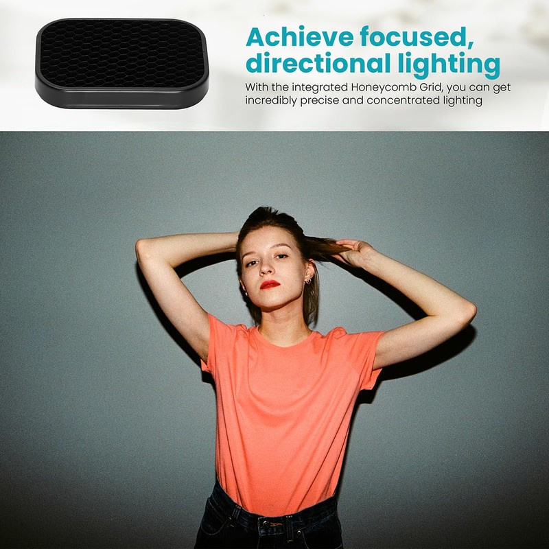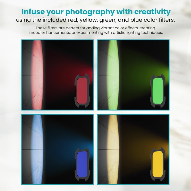• EASY MODIFICATION - Quickly attach and detach the grid and color filters (red, yellow, green, blue) to modify light output, adding creative effects and color correction in seconds.