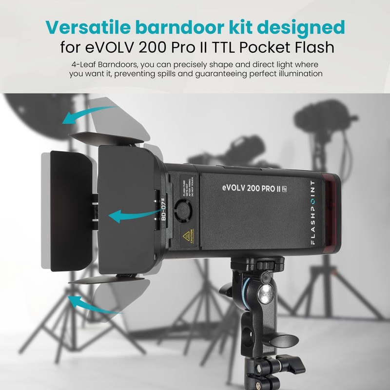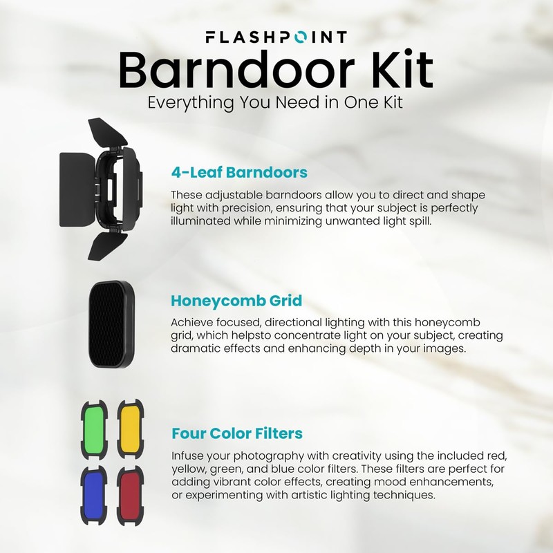 From enhancing your portrait sessions to elevating your product photography, the Flashpoint Barndoor Kit for the eVOLV 200 Pro II TTL Pocket Flash is the ultimate versatile lighting accessory. This compact yet powerful kit is meticulously designed to offer photographers precise light control and creative flexibility. The Flashpoint Barndoor Kit includes essential components to refine your lighting setup:- 4-Leaf Barndoors: These adjustable barndoors allow you to direct and shape light with precision, ensuring that your subject is perfectly illuminated while minimizing unwanted light spill.- Honeycomb Grid: Achieve focused, directional lighting with this honeycomb grid, which helps to concentrate light on your subject, creating dramatic effects and enhancing depth in your images.- Four Color Filters: Infuse your photography with creativity using the included red, yellow, green, and blue color filters. These filters are perfect for adding vibrant color effects, creating mood enhancements, or experimenting with artistic lighting techniques.Designed specifically to seamlessly fit the eVOLV 200 Pro II and compatible with the H200 II flashhead, this barndoor kit is an indispensable tool for photographers aiming to craft stunning visuals with ease. Whether you're working in a studio environment or shooting on location, the Flashpoint Barndoor Kit empowers you to take your lighting to the next level, ensuring professional-q