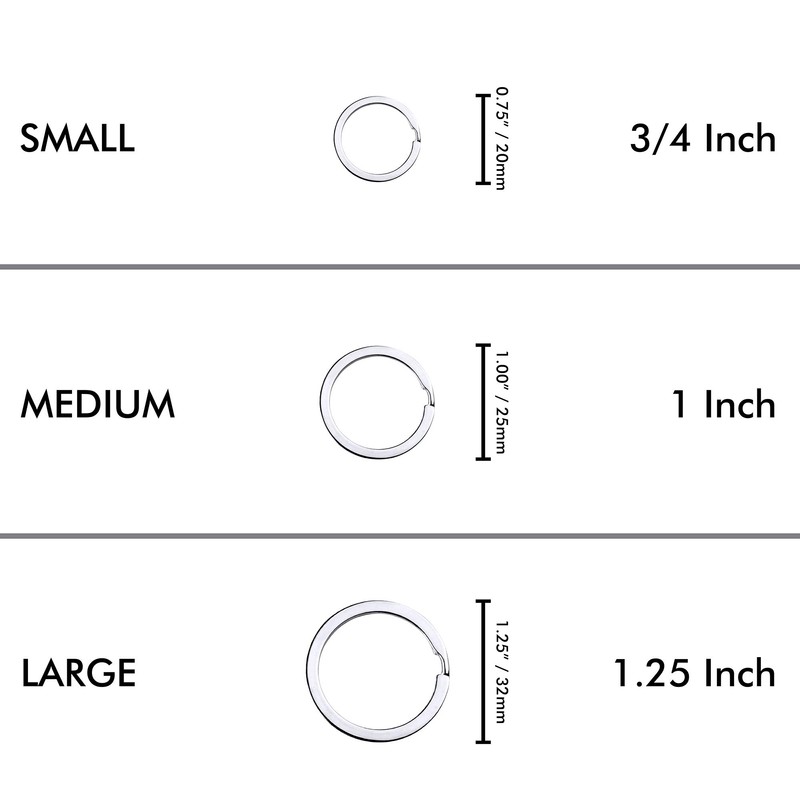 - DIMENSIONS: Round flat key chain rings are 3/4 Inch in diameter. Each set comes with 30 pieces of keyrings in silver color. Different sizes to suit different and diversified needs.