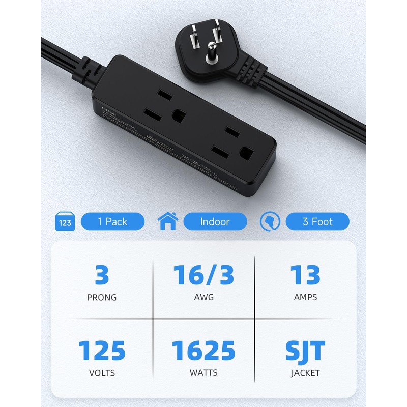 • [3-Way Outlet Design]: Unlike traditional extension cord, this 3ft black power strip features 2 front-facing + 1 rear-facing 3-prong grounded sockets—enables hassle-free plugging of multiple devices without blocking, ideal for tight spaces. Max 1625W (125V/13A)