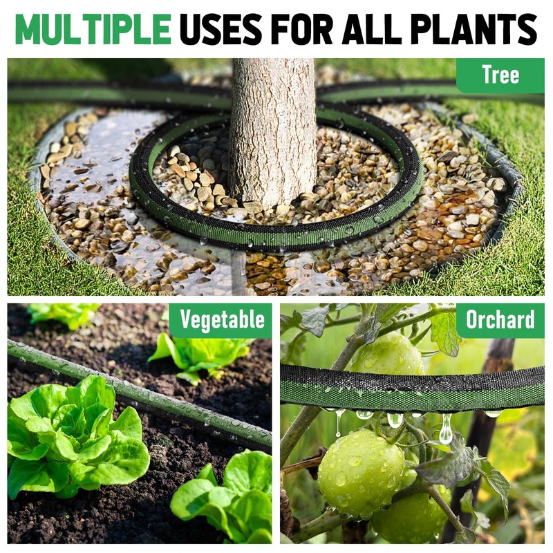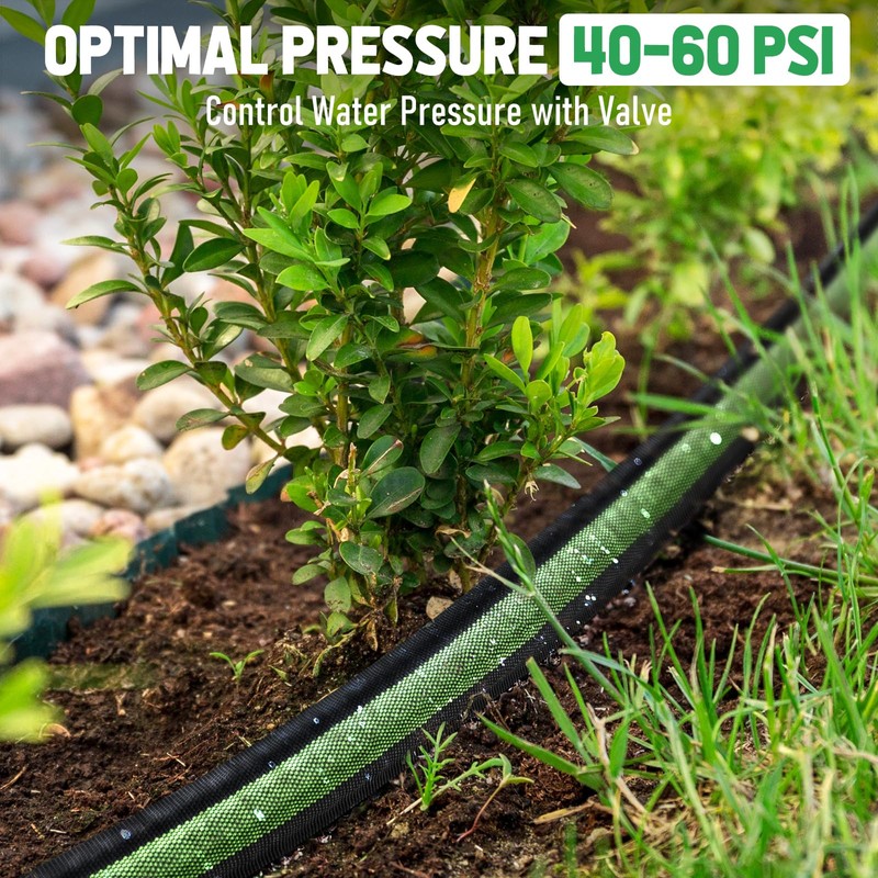 - Ultra-Durable & Sun-Resistant Soaking Hose: Made with UV-resistant rubber + reinforced fabric cover, our drip irrigation hose withstands kinking, (30-40 PSI recommended), and harsh weather. Lies flat makes it a breeze to roll up and store for next season.