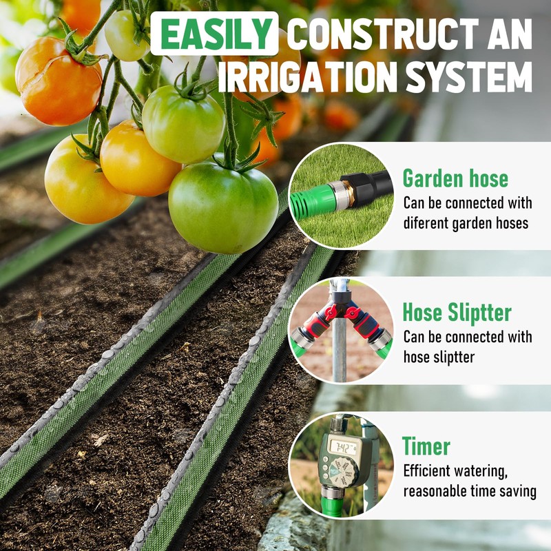 - DIY Drip Hose for Custom Irrigation: The end-to-end connectable flat soaker hose with 3/4" rust-proof metal connectors. Easily connect multiple hoses and works well with timers. Compatible with faucets and splitters—build a leak-proof system in minutes.