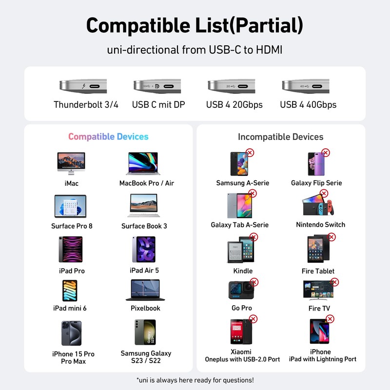 ●Up to 7680x4320 @240z seamless HDMI video streaming from your laptop or devices. No requirement of power or odd driver. Display performance is subject for your host device and external display