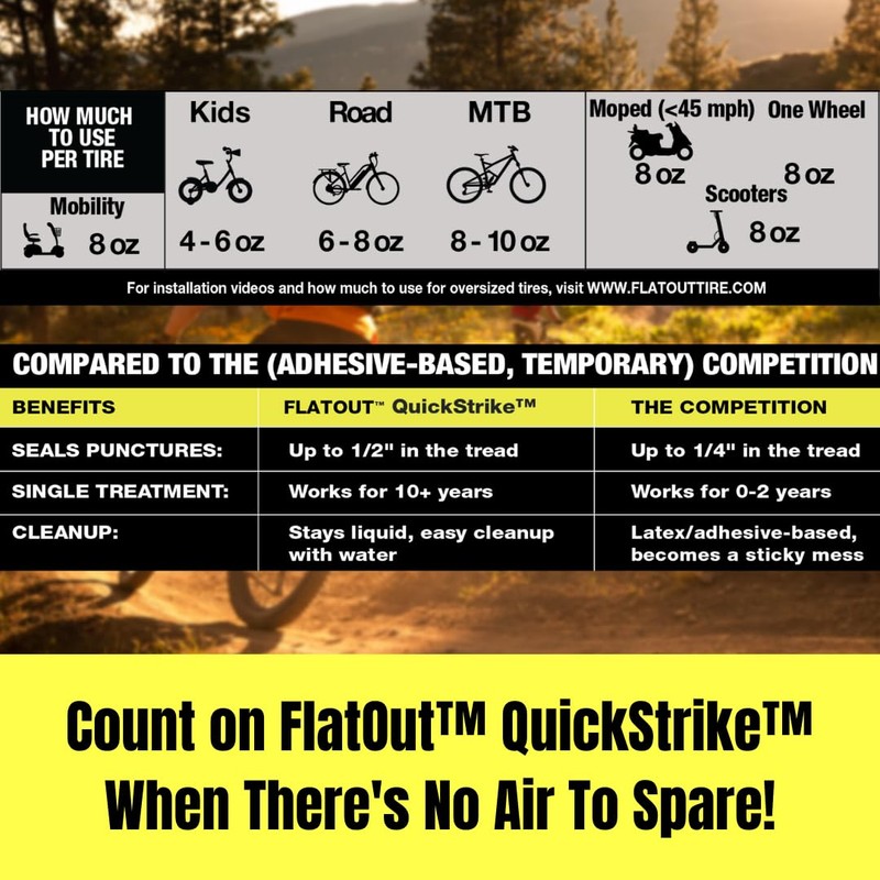 - OUR FASTEST SEALING FORMULAS YET: **NEW** FlatOut QuickStrike Small Tire/Bicycle Formula flows to the puncture quicker for when there's no air to spare.and it is easier to install!
