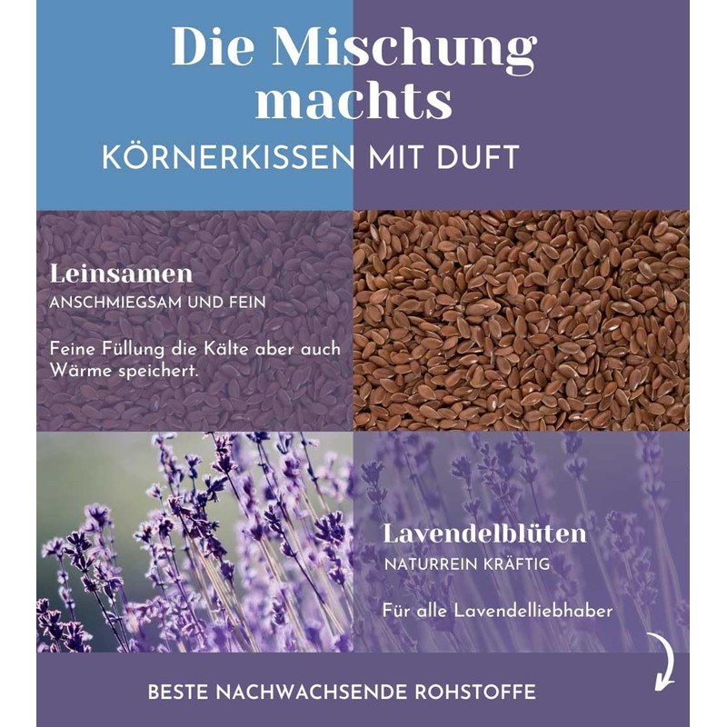 - For all lavender pillow friends: our heat cushion now also with fragrance. Our flax seeds retain heat and cold, the lavender flowers provide the aroma.