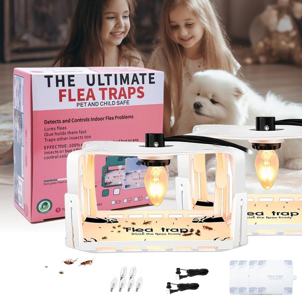 Flea Traps for Inside Your Home 2 Packs, Flea Trap with Light for Indoor Bed Bug, Flea Killer Pest Control, Non Toxic & Harmless, Friendly to Pets & Kids, with 6 Sticky Refills and 6 Lightbulbs