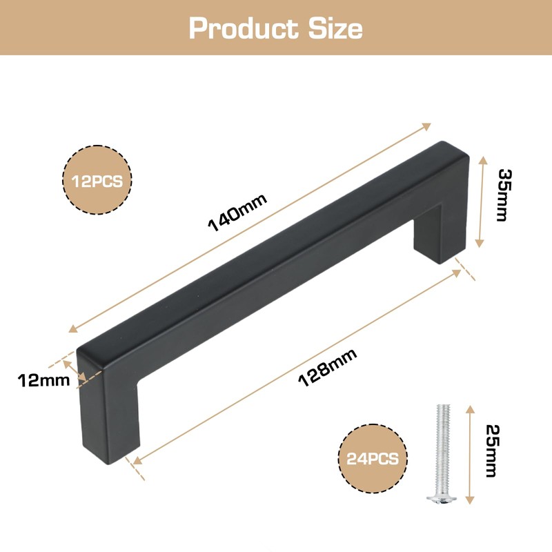 - Perfect Size Each cabinet handle has a hole spacing of 128mm, total length of 140mm, width of 12mm and height of 35mm. It is suitable for various furniture, such as cabinets, drawers and doors to ensure a precise fit for your furniture needs.