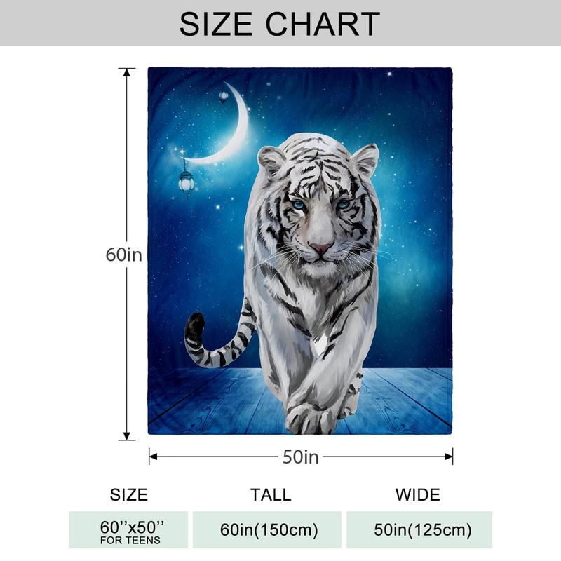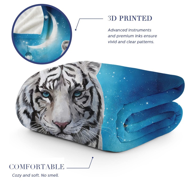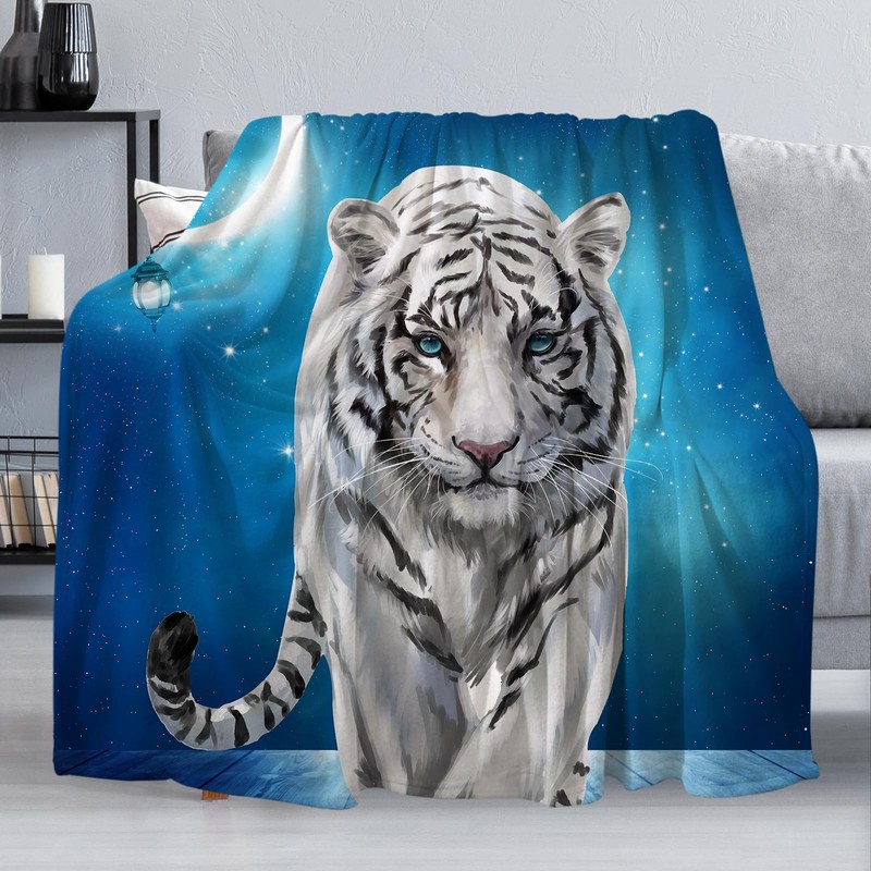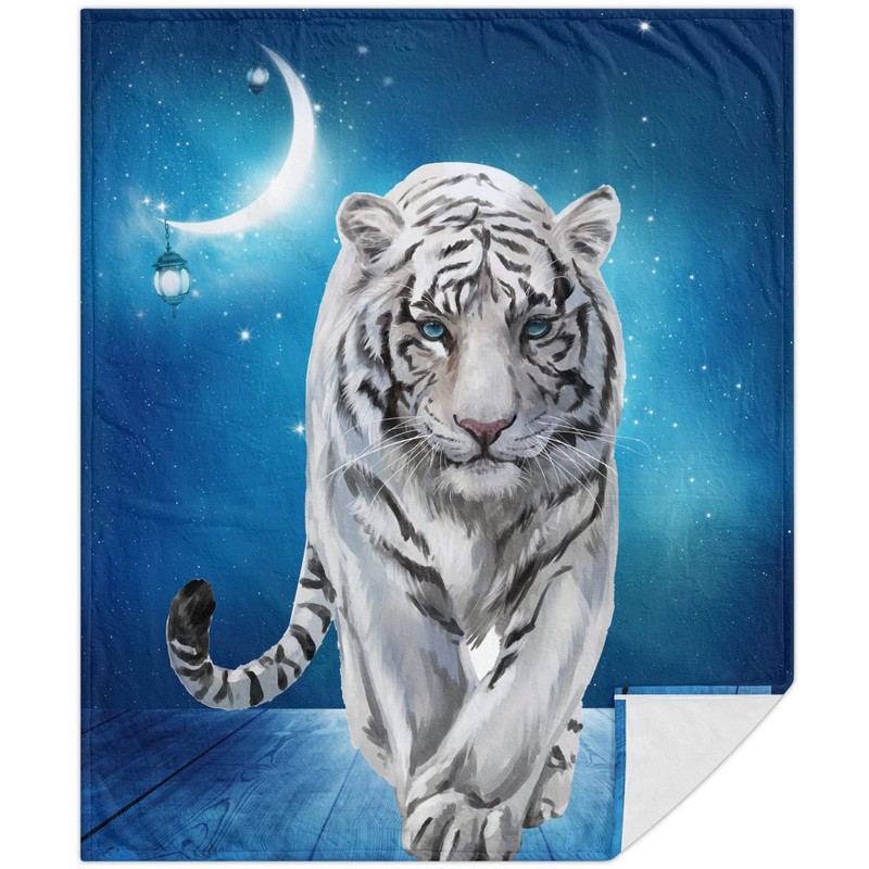 Fleece Throw Blanket 50"x60", Soft Cozy Warm Fuzzy Flannel Plush Blanket Siberian White Tiger Under The Blue Starry Night Blanket for Couch, Sofa, Bed, Living Room