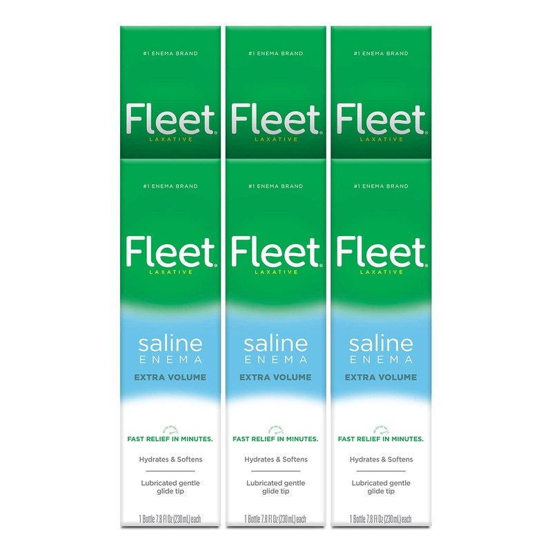 Fleet laxative saline enema 7.8 oz, Pack of 6. 25% more lubrication, gentle glide flexible tip designed for maximum comfort easy squeeze disposable enema- just insert, squeeze, remove, and discard