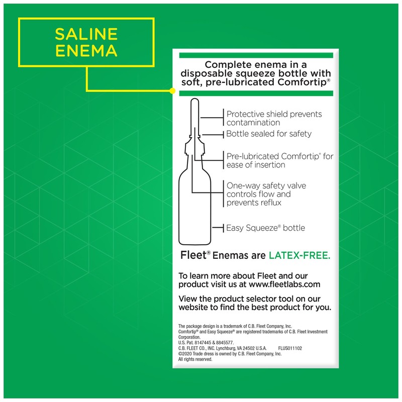 Help alleviate occasional adult constipation with Fleet Saline Enemas. They feature a soft, pre-lubricated Comfortip for easy insertion and have 25% more lubrication for maximum comfort, making it a practical choice to help relieve occasional constipation or prior to colonoscopies and other rectal exams. Fleet Saline Enemas are a saline laxative that provides reliable relief from adult occasional constipation. Containing a protective shield that prevents contamination, latex-free Fleet Saline Enemas are safe to use when used as directed. Made by the #1 doctor-recommended rectal laxative brand*, Fleet Saline Enemas provide fast, predictable relief in minutes. *ProVoice data 02.1.18 to 01.31.19