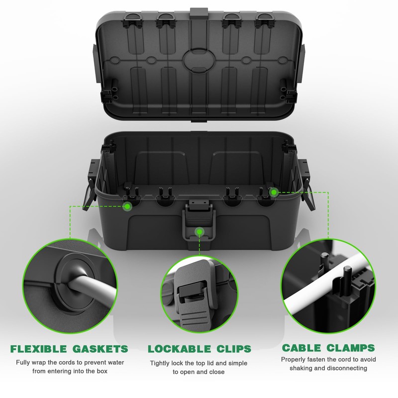 - With the 4 clips, top lid, and rubber gaskets, this outdoor extension cord cover box is IP54 waterproof. Perfect to seal 12/14/16 gauge cord, braided cable and flat wire.
