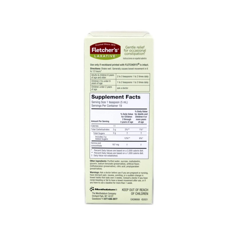 Fletcher’s Laxative is a liquid herbal supplement made with natural senna, designed to offer gentle relief from occasional constipation for children and adults ages 2 and up. Trusted since 1871, this formula is safe, effective, and flavored with root beer to make it easy to administer. Fletcher’s uses senna pods, which are gentler than senna leaves, and has been shown to work in as little as 6 to 12 hours. Each 5 mL serving contains 167 mg of senna pod concentrate. The supplement contains 11 calories per serving and 3 g total sugars. Other ingredients include purified water, sucrose, maltodextrin, glycerin, flavor, and preservatives such as sodium benzoate, methylparaben, and propylparaben. Shake well before use and follow age-based dosing instructions. Manufactured by The Mentholatum Company, Orchard Park, NY. Questions Call 1-877-636-2677.