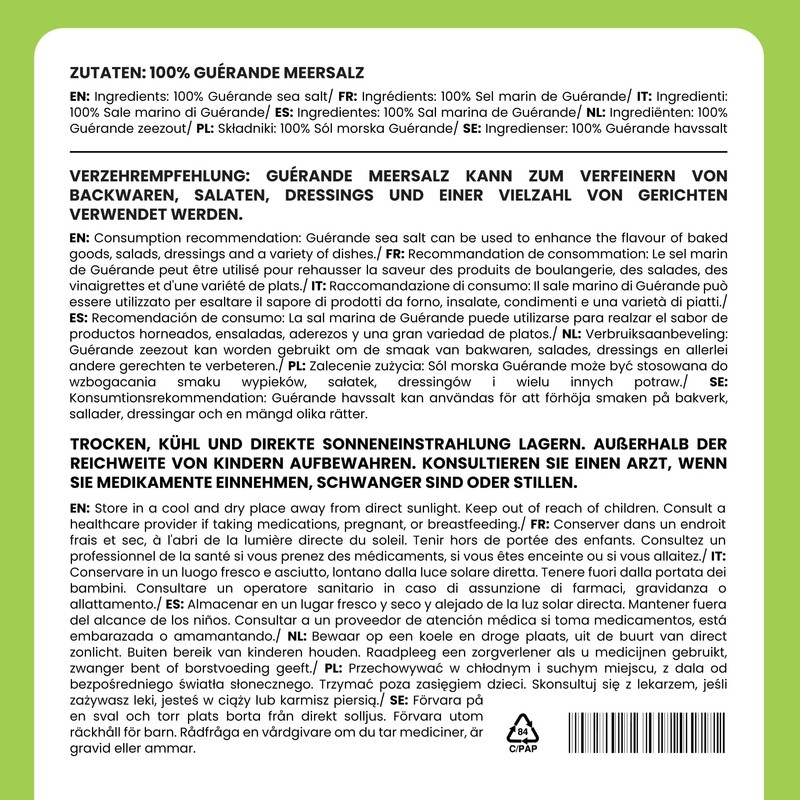 - Commitment to quality: Sel de guerande is a genuine natural product harvested by hand by dedicated farmers. As this is a natural product, slight variations in colour, grain size and composition may occur, but these do not affect the quality of the product.