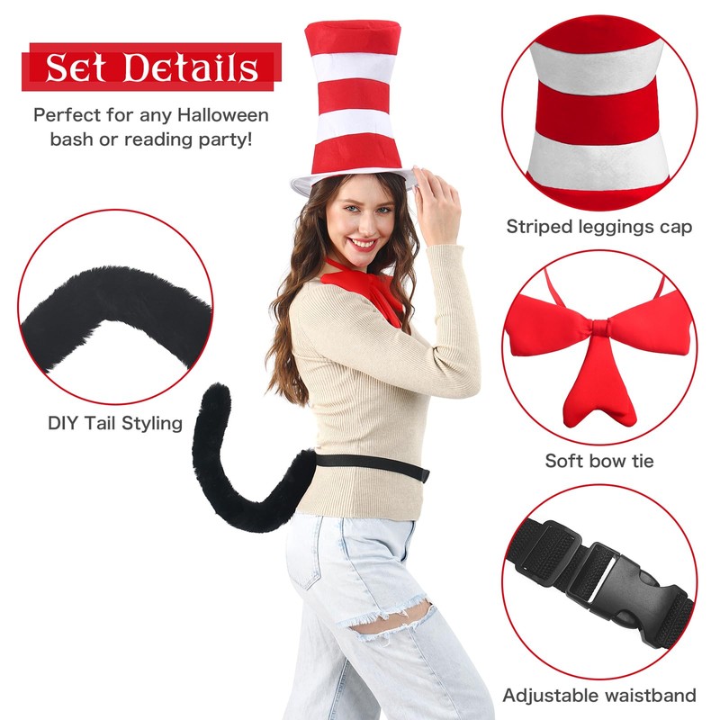 - Set Includes: Red and white striped hat x1, Big red bow tie x1, 25-inch Length black cat tail x1 to help you create amusing cosplay experience