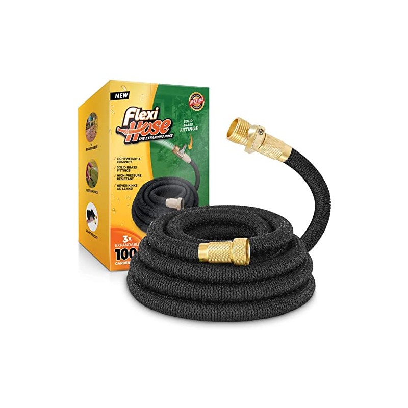 Flexi Hose Lightweight Expandable Garden Hose, No-Kink Flexibility, 3/4 Inch Solid Brass Fittings and Double Latex Core (100 FT, Black)