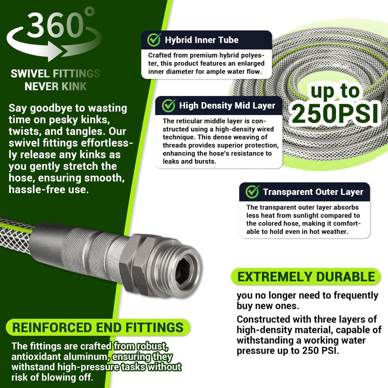 - The all-weather use and leak-proof design of this hose make it perfect for any temperature, whether hot or cold. The transparent outer layer reduces heat absorption, keeping the hose flexible and easy to coil and uncoil. With triple layers of strength, this hose is durable and resistant to leaks and abrasions