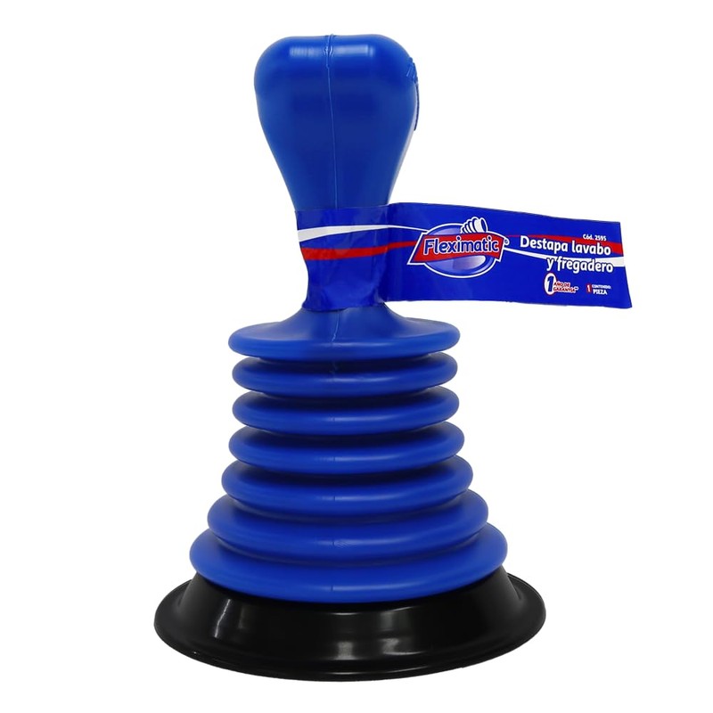 Fabricado de polipro y empaque de PVC flexible. Diámetro 12 centímetros. Destapa lavabos y fregaderos obstruidos por desechos como basura, comida, cabello y otros residuos. La base flexible se comprime y descomprime ejerciendo presión en el mango con la mano, la cual aventara aire y el empaque realizará un sello, nos ayudará a que el aire expulse el objeto o comida que obstruye el flujo del agua de nuestro lavabo o fregadero.