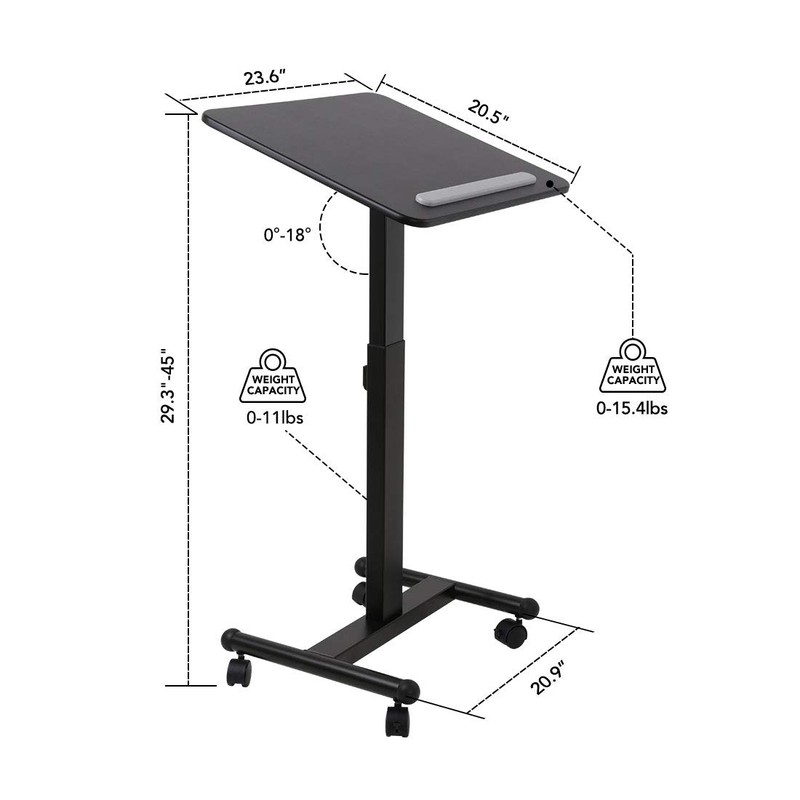 - Gas-Spring Pneumatic Desktop - Adjust from 29.3" to 45" high, and any height in between, with a built-in gas spring that offers quick, one-handed adjustments. The spacious desktop (23.6" x 20.5") holds any size laptop or a tablet with keyboard. Desktop is 1" thick.The tiltable desktop is conducive to the use of mobile laptop desk. Excellent computer workstation overbed table with wheels for offices, home, medical, school for classrooms.
