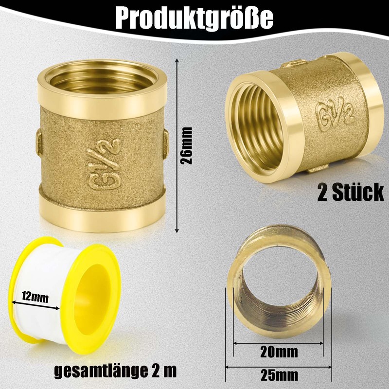 • Sleeve 1/2 inch: you will receive 2 brass sleeves and 1 roll of 2 m long thread sealing tape. The adapters have an internal thread diameter of 20 mm and are 26 mm long and are suitable for use with two G1/2 inch outer pipes.