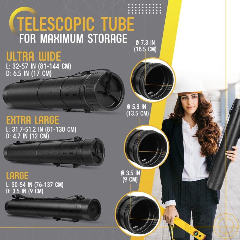 - Extendable (31.7" min -51.2" max) Length: The adjustable 4.7 Inch inside diameter poster tube including 10 locking positions provides large internal storage space and high flexibility for users. Great for storing drawings, maps, blueprints, engineering supplies, surveying equipments & more!