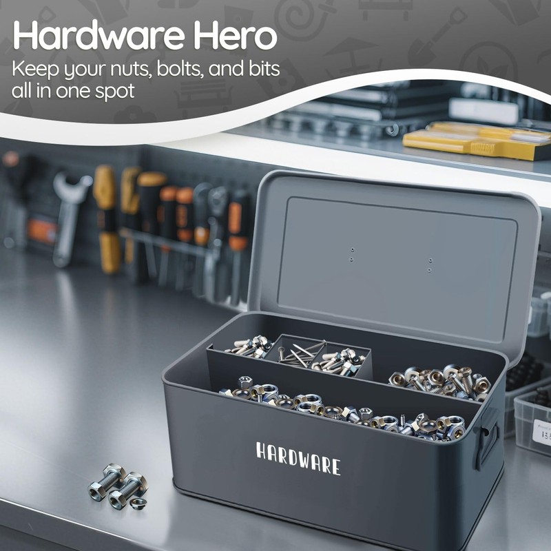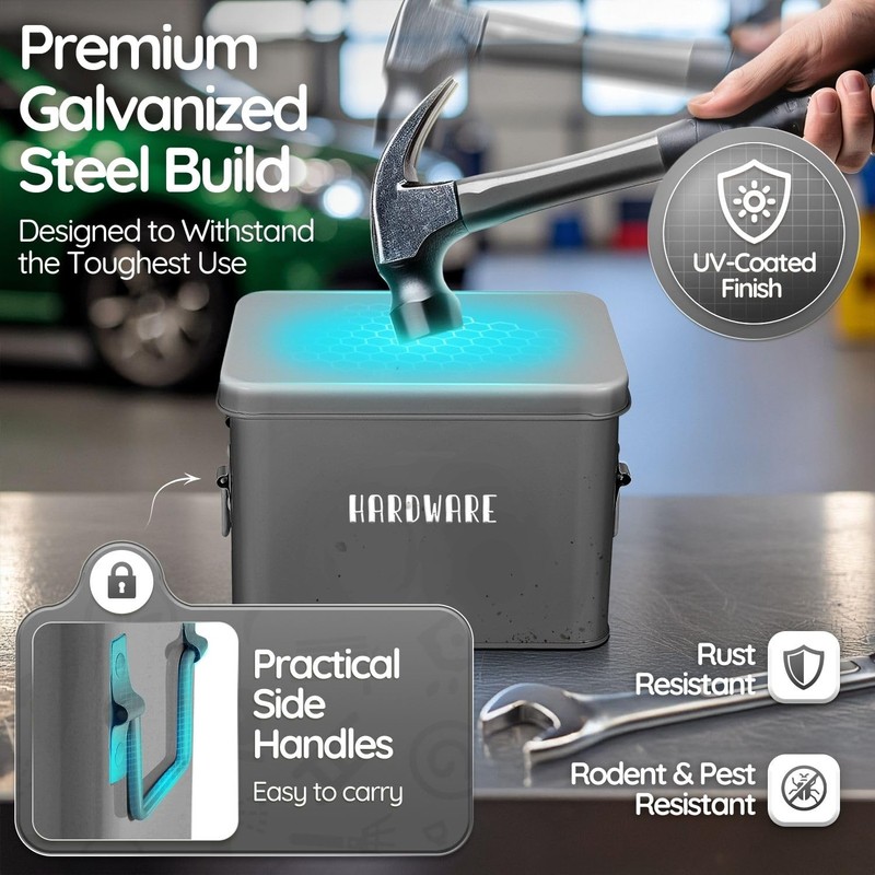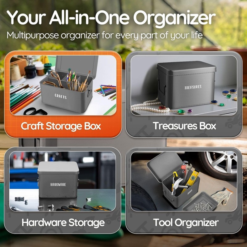 - 1x Tin Storage Box with Removable Tray, 8 Inch Seed Organizer Box and Metal Seed Holder Organizer with Hinged Lid, Toolbox Container for Crafts, Hardware, Tools, Essentials – Gray