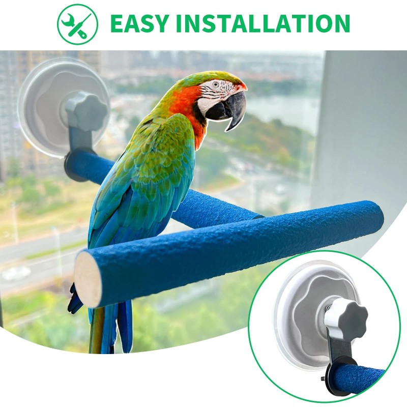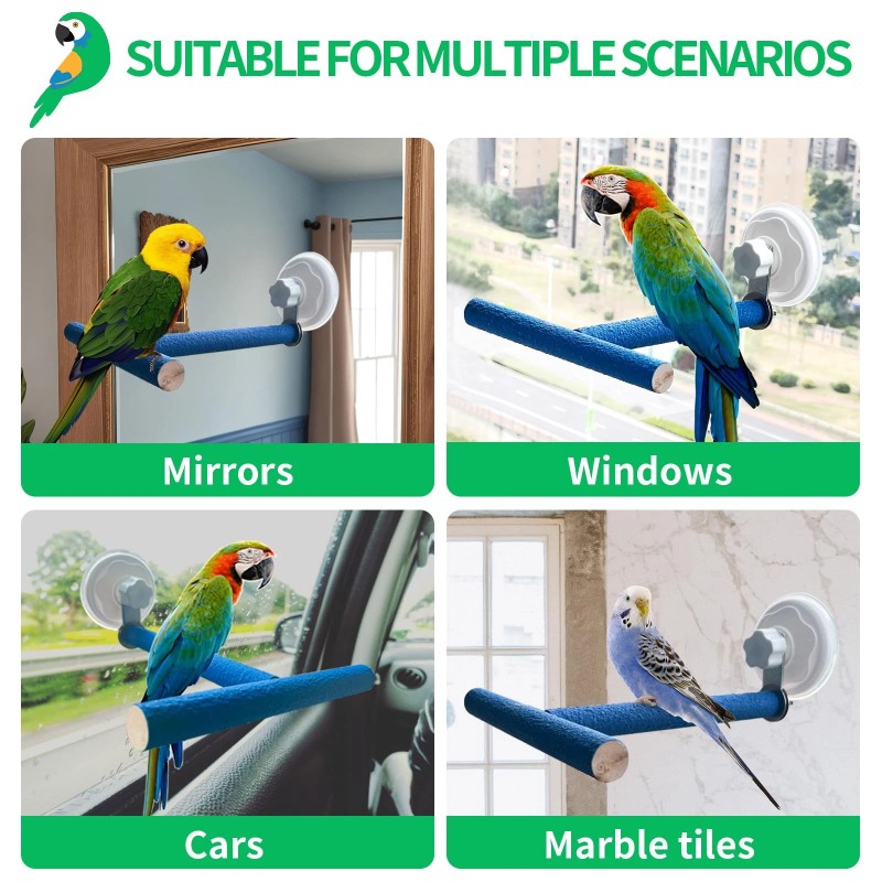 Easy to Install: This suction cup perch for birds has a powerful suction cup, put some water on the suction cups before use and rotate them to hold them in place. Parrot perches for large birds can be easily attached to any smooth surface such as tiles, mirrors, glass, windows. Whether you want to put it in your window or bathroom for your bird to hop around and practice flying, or take it on a car ride, this perch is very practical in its uses.