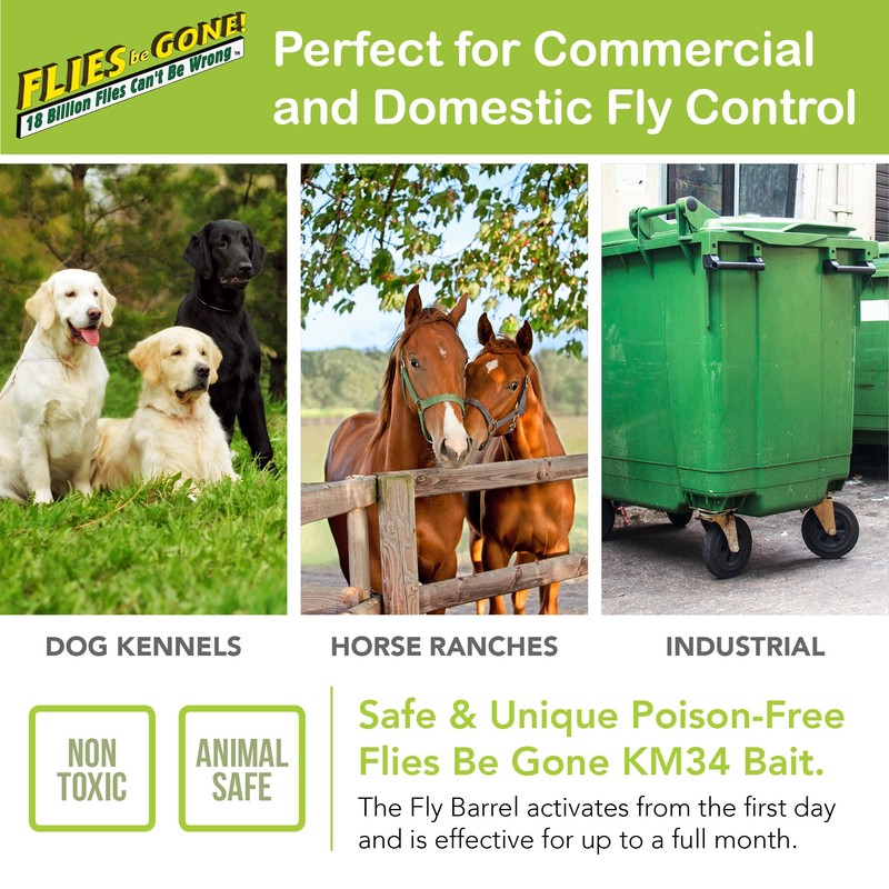 - Flies Be Gone Barrel: Reusable or disposable and comes with a free refill bait. Add bait to Barrel with water and hang. Can be reused with refill baits or discarded... Your choice!