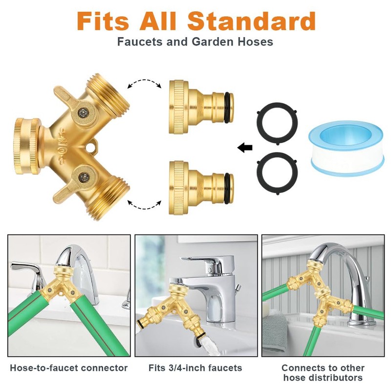 - 【NINE-IN-ONE SET】This garden hose accessories set includes a variety of practical components. A 3/4-inch garden hose diverter, 2 rust-proof copper garden hose faucet connectors, 4 anti-aging rubber washers for enhanced sealing performance, an adapter for 1/2-inch threaded ports, and a roll of waterproof raw tape to ensure the interface is sealed. It fully meets the connection and use needs of various water use scenarios.