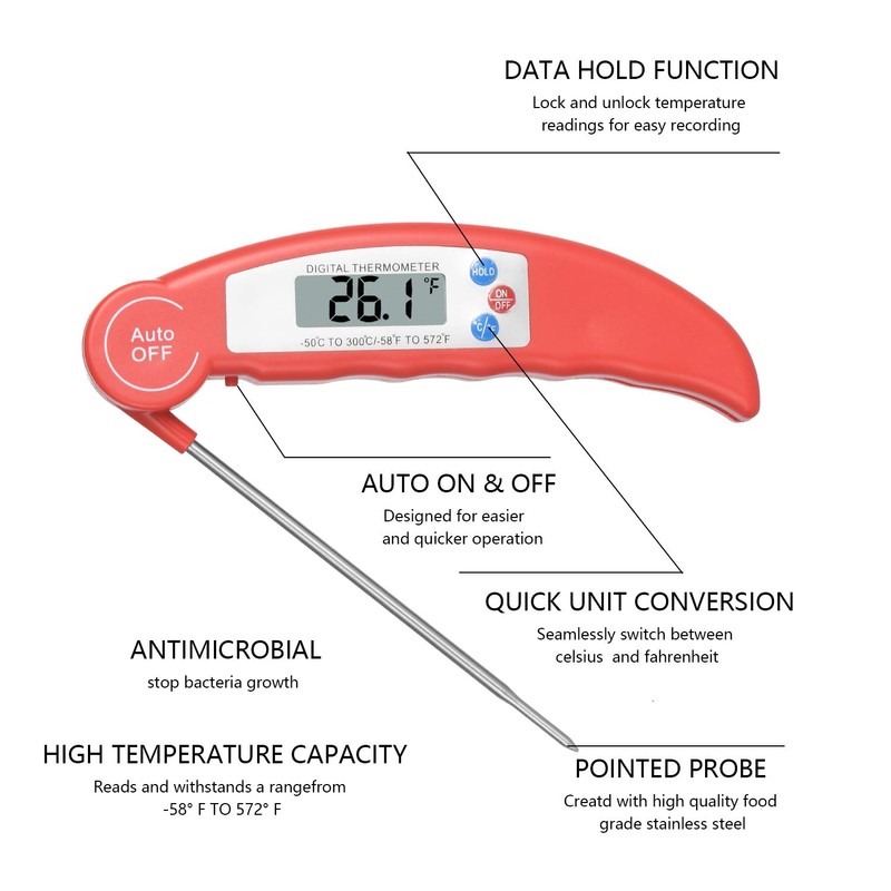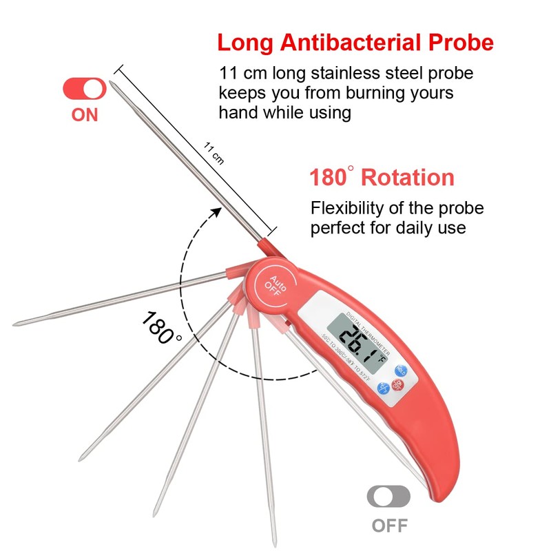 - 🍤【AUTO ON/OFF】:With the intelligent automatic ON/OFF function, the thermometer probe turns on or off by itself when you unfold or fold the probe. Digital meat thermometer will auto-shut off to save battery life if readout stays for 10 minutes.