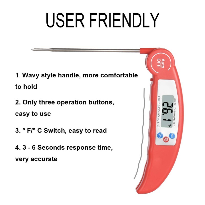 - 🍤【AUTO ON/OFF】:With the intelligent automatic ON/OFF function, the thermometer probe turns on or off by itself when you unfold or fold the probe. Digital meat thermometer will auto-shut off to save battery life if readout stays for 10 minutes.