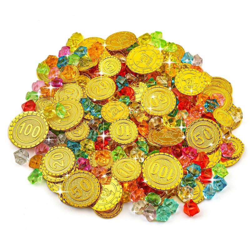 - 🌟🌟【High-Quality Material】The gold coins are all made of environmentally friendly plastic with a high gloss. The gemstones are made of high-quality acrylic, irregular in shape, and translucent in color to reveal bright luster. They are sturdy, non-toxic and reusable.