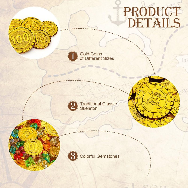 - 💎💎【Exquisite Design】The pirate gold coin has two different sides, featuring an embossed design of a classic skull theme and pirate symbols. Colorful gemstones and gold coins have a realistic appearance, which can fully stimulate children's imagination and adventurous spirit. With Pirate Treasures, kids can go on adventures and treasure hunts together!