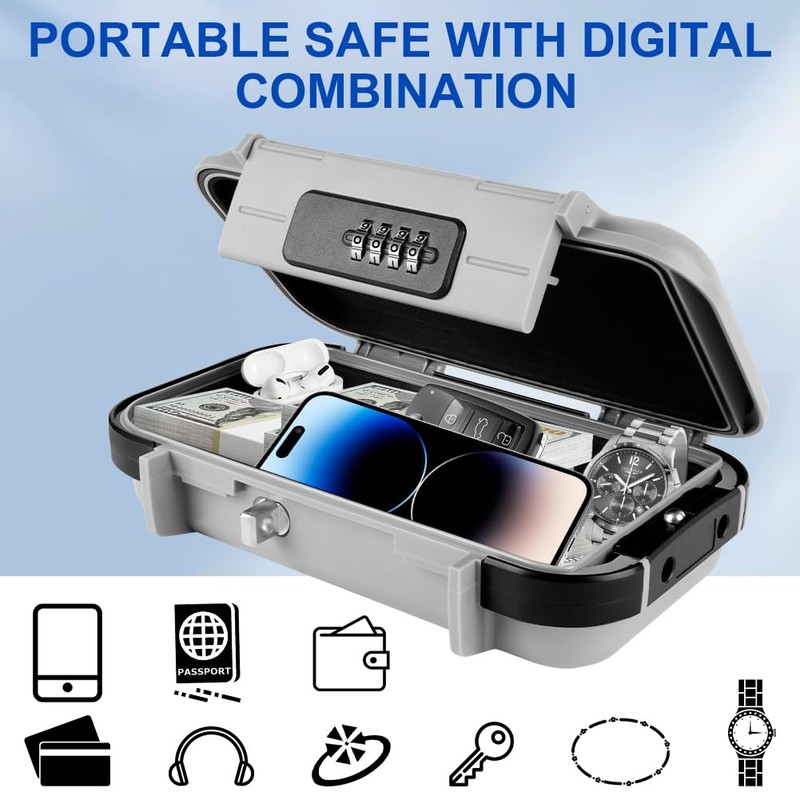 - 【Safety and Waterproof】The outer shell of the portable safe is made of tough high-strength ABS material, which gives it unique resistance to falling and impact, and builds a solid line of defense for your valuables. The interior is completely sealed by a precisely installed silicone waterproof seal ring, which effectively isolates moisture and ensures that the items in the safe are still safe even in the event of an unexpected bad weather