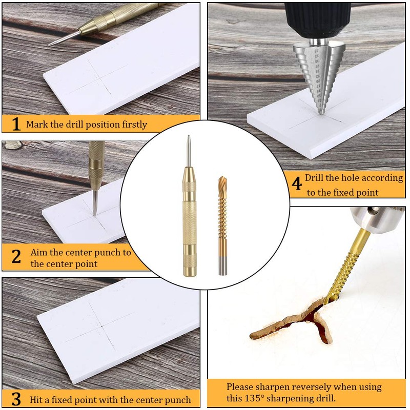 - 📦【WHAT YOU GET】: 1 x 5-35mm Step Drills, 1 x Automatic Center Punch and 1 x Twist Drill Bit.