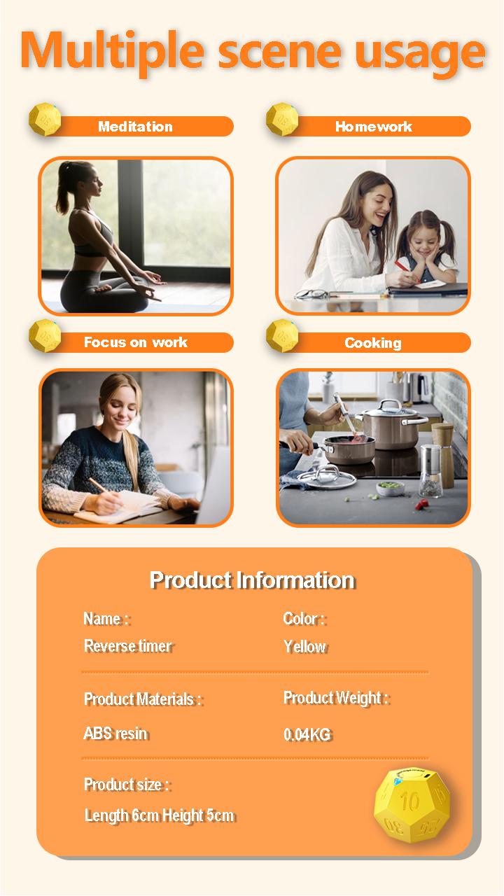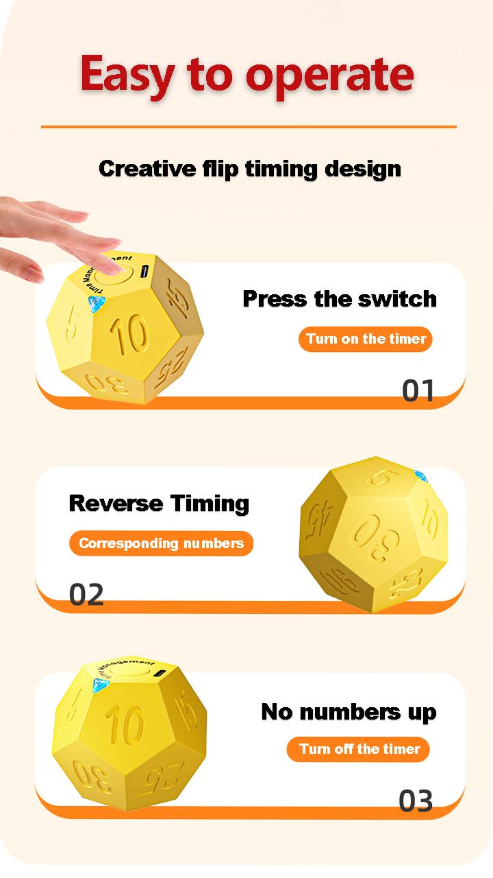 Each of the 12 surfaces represents a different pre-set time interval, so all you have to do is flip to the side that matches your task! Whether you're timing work sessions, cooking, or workouts, these timers provide a simple, effective way to keep track of time without the stress of constant checking.