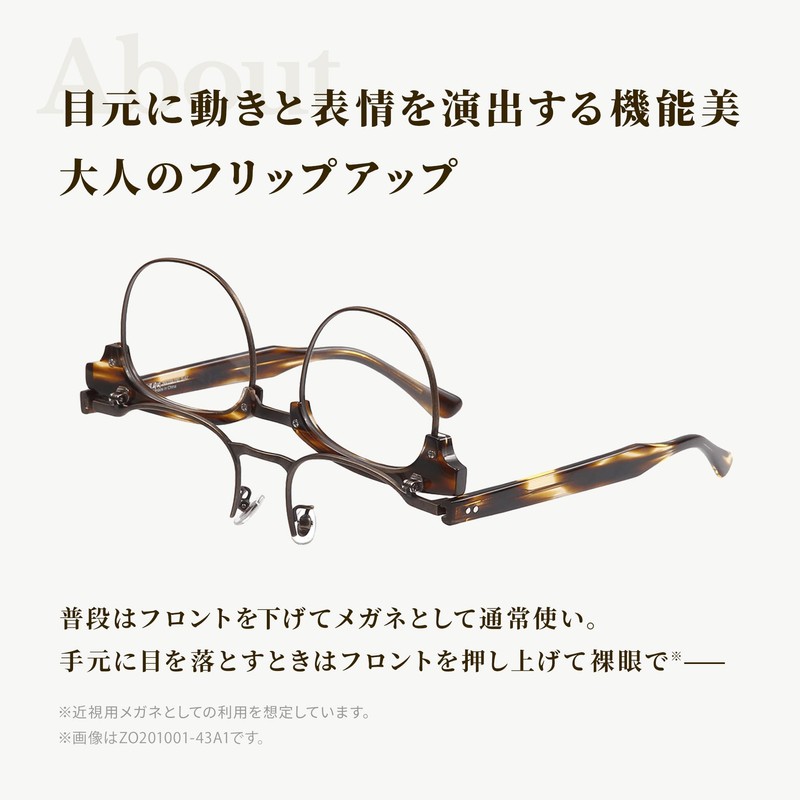• ・普段はフロントを下げてメガネとして日常使い。手元に目を落とすときはフロントを押し上げて裸眼で(※1)。 ※1 近視用メガネとしての利用を想定しています。