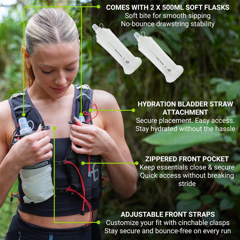 - Hydration-ready: Includes two 500ml FlipBelt Soft Flasks (Fog) + 2.5L rear bladder sleeve