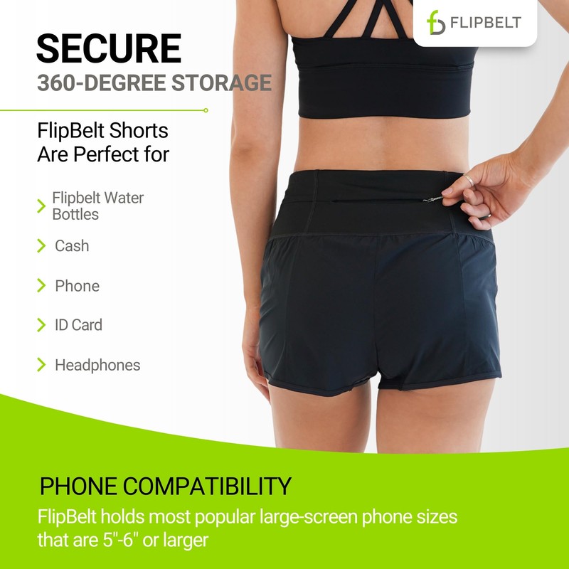 - RUNNING SHORTS WITH POCKETS: To keep you connected while on the run, we created Women’s Running Shorts with the storage power of the FlipBelt Running Belt. These shorts are a hands-free phone holder for running, a carrier pouch for small essentials, and a comfy addition to your gym wardrobe.