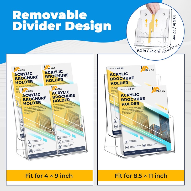 - Versatile Brochure Display: The dimensions of this 2-tier brochure holder are 9.5 in L × 4.5 in W × 10.6 in H ( 240 mm × 115 mm × 270 mm ). The pamphlet holder features a removable divider, making it compatible with both 8.5" x 11" and 4" x 9" brochures, providing a flexible display solution.