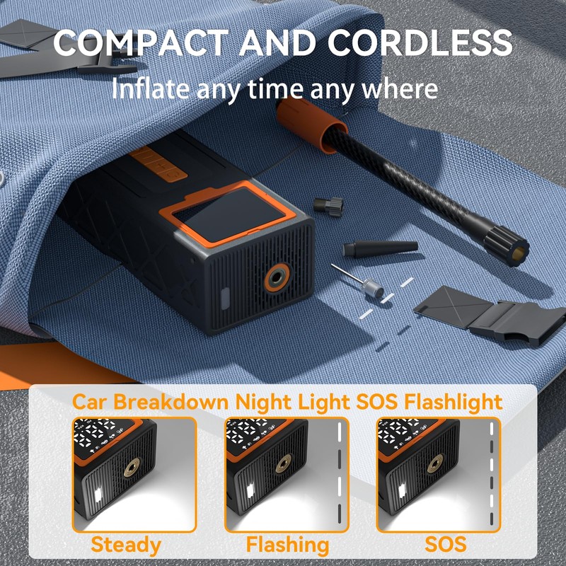 - 【Portable Design & Emergency LED Light】Compact and lightweight , this portable air pump includes a 0.3W LED flashlight with 4 modes (normal, emergency, strobe, SOS), ideal for nighttime or emergency use.
