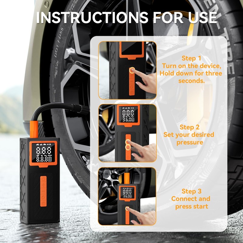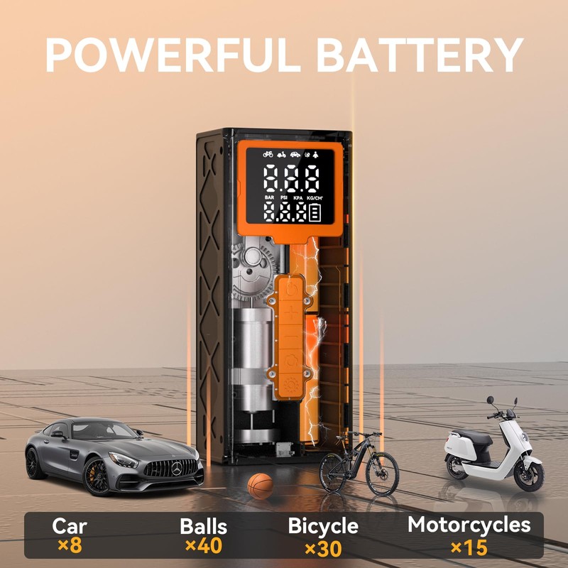 - 【Multi-Purpose Air Compressor】This portable tire inflator is perfect for cars, motorcycles, bikes, and basketballs. With 5 preset modes (Car: 2.5BAR, Motorcycle: 2.4BAR, Bike: 45PSI, Basketball: 8PSI, Custom Mode: 35PSI), it meets all your inflation needs.